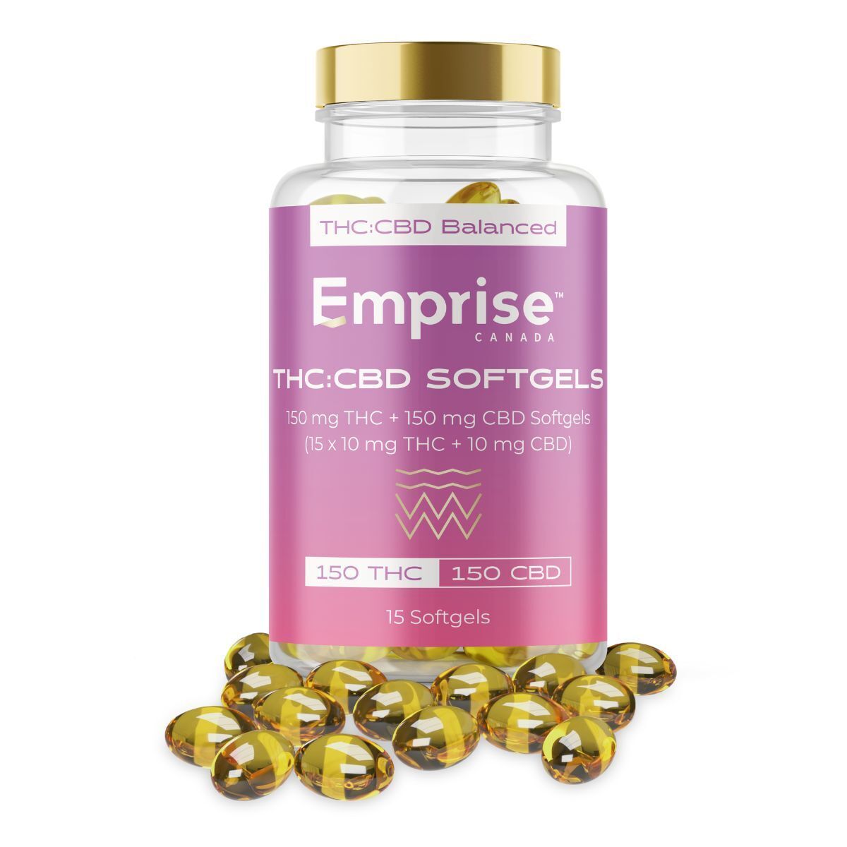 Emprise’s 150 mg THC + 150 mg CBD Softgels (15 x 10 mg THC + 10 mg CBD) contains 15 softgels. Each softgel has 10 mg THC & 10 mg CBD. The product is formulated with Full Spectrum THC:CBD Cannabis Extracts and hemp seed carrier oil which supports the Entourage effect, making this product the first true-to-plant softgel on the market. After all if it grows together, it goes together.