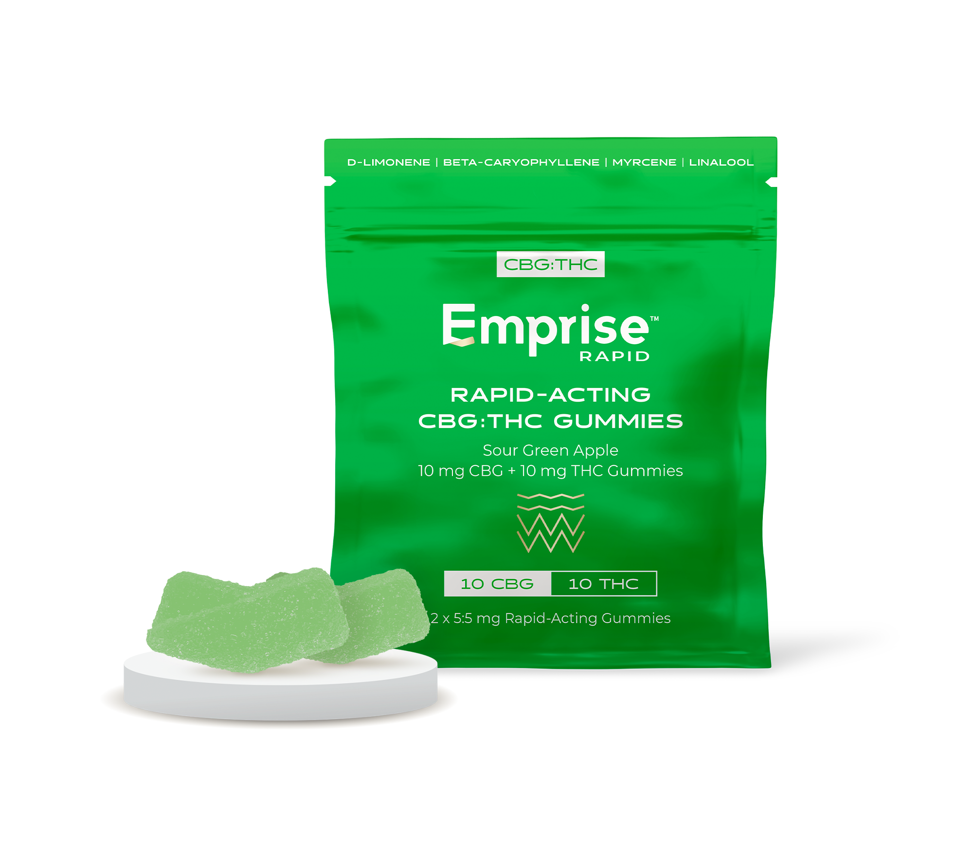 Emprise’s Rapid Onset Sour Green Apple 10 mg CBG + 10 mg THC Gummies is a CBG:THC formulation that is active in 8-12 minutes using Emprise's Advanced Nano THC Technology. Each Gummy delivers a potent 5 mg CBG & 5 mg THC.