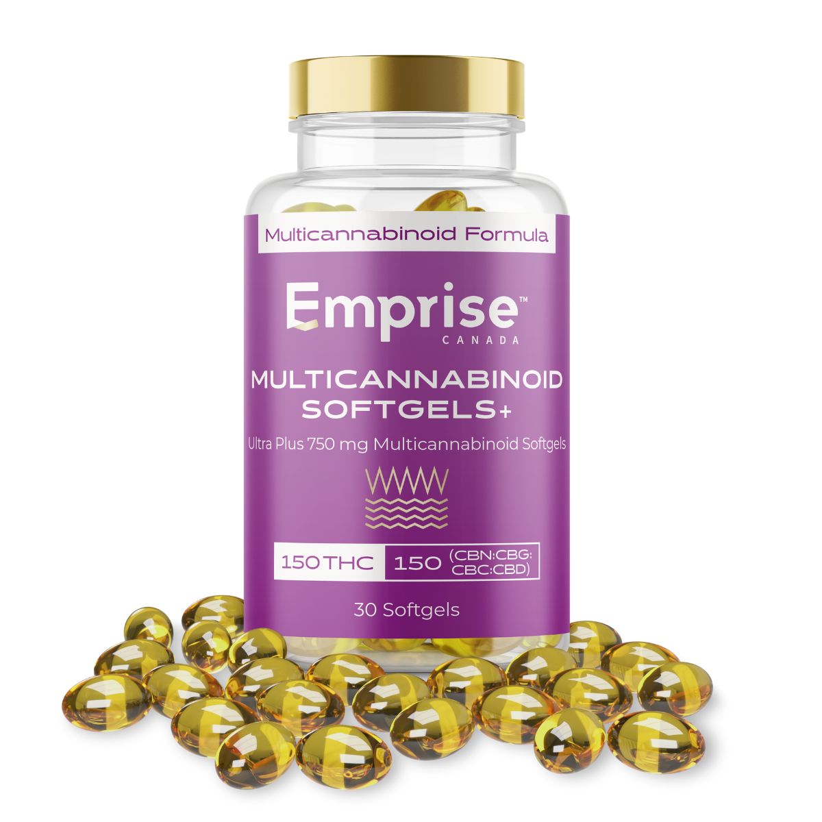 Emprise’s Ultra Plus 750 mg Multicannabinoid Softgels contains 30 softgels. Each softgel has 5 mg THC:CBN:CBG:CBC:CBD.