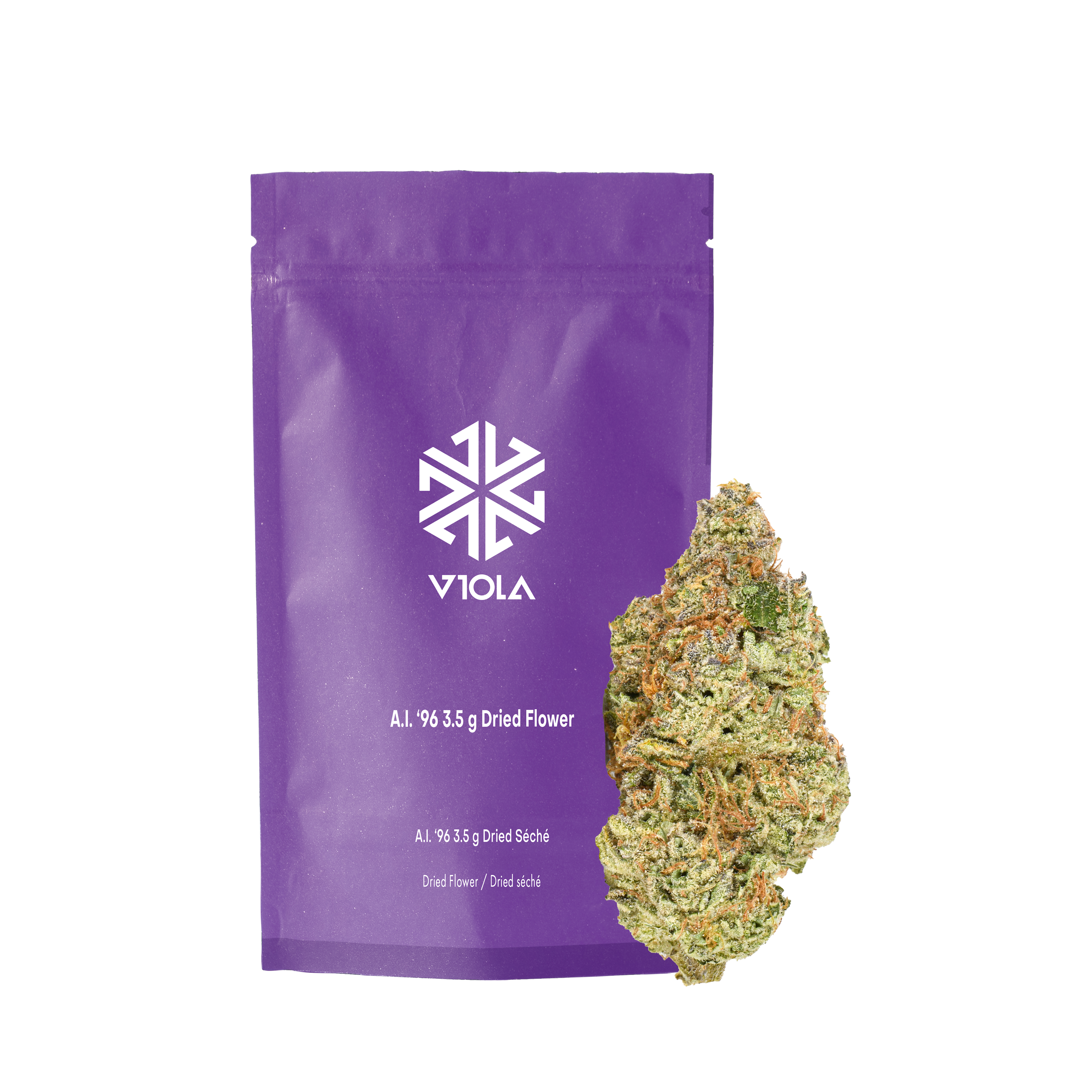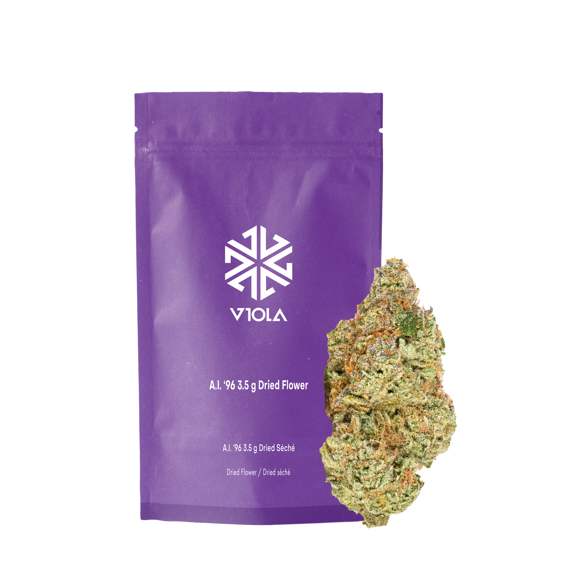 AI’96 Cannabis Flower from Viola is a Indica-dominant strain, known for its light green colouring and purple undertones with a thick, smothering layer of trichomes.