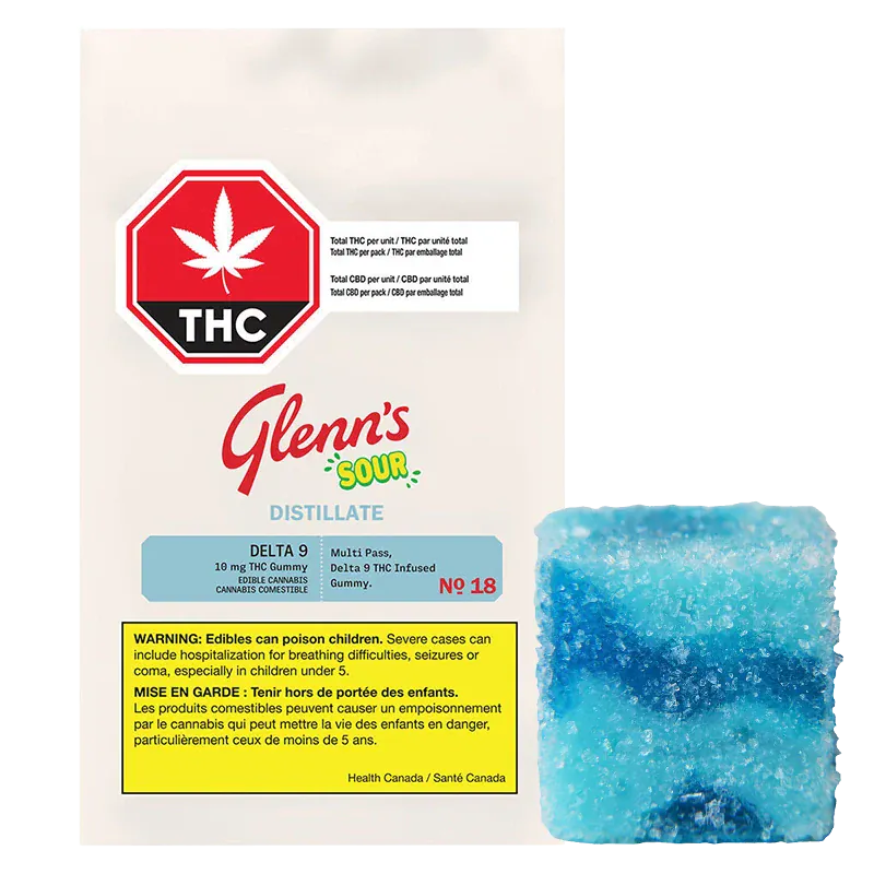 Glenn’s No. 18 Sour Blue Raspberry takes the same classic Glenn’s soft chew and turns up the sour. A sharp and tangy bite meets smooth blue raspberry sweetness in every piece. Infused with delta-9 THC distillate, each soft chew delivers consistent potency you can count on. Handcrafted by one of Canada’s leading soft chew producers, Sour Glenn’s are built bold, potent and made the way soft chews were meant to be.