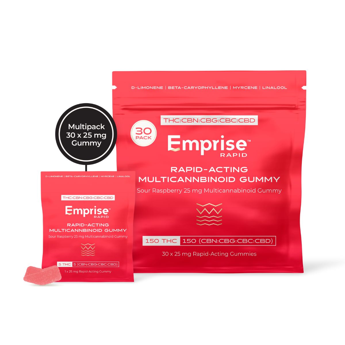 Emprise's Rapid Onset Sour Raspberry 25 mg Multicannabinoid Gummies is a THC:CBN:CBG:CBC:CBD formulation made with Emprise's Advanced Nano THC Emulsions that have a rapid onset in as little as 10-15 minutes.